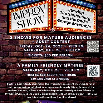 For Adults: Friday and Saturday Oct. 24-25 at 7:30 pm. Two Evening Shows will be presented for mature audiences (with adult content). Tickets are $30 per person. Click Here for Tickets to the Adult Improv Shows