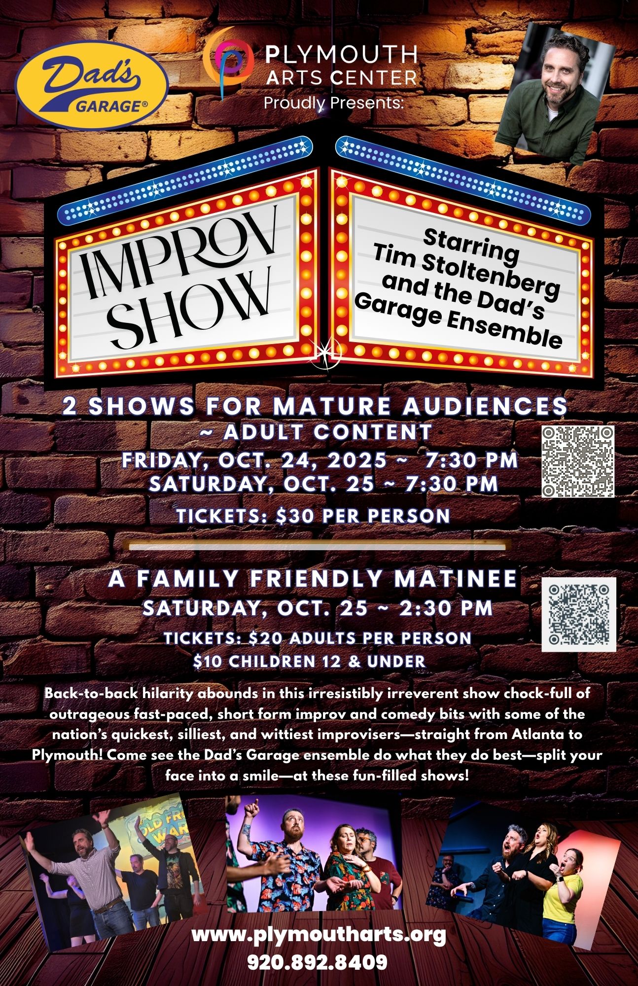 Pre-registration is required for Team Building, Leadership Training, and for the Improv Workshops. Tickets will be available in advance and at the door for the Improv Live Shows, however, seating will be limited to the first 150 guests. For registration and tickets for all events, visit the PAC website at PlymouthArts.Org or call 920.892.8409. The program coordinator is Cindy Haase, PAC’s Executive Assistant. Businesses may request an in-person or online presentation. Email Cindy: cindy@plymoutharts.org