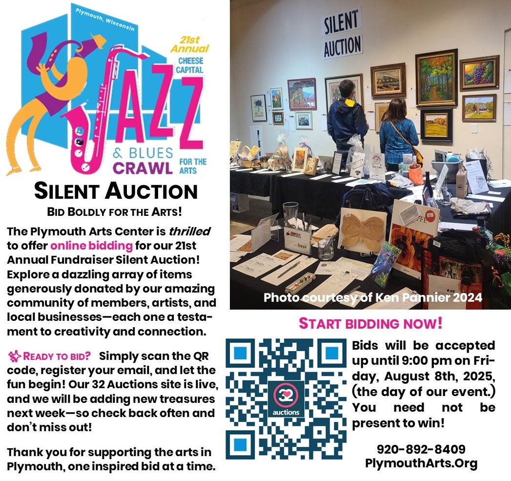 This year’s 21st Annual Cheese Capital Jazz & Blues Crawl for the Arts adds a new rhythm to the mix—online bidding for all silent auction items! Whether you’re scouting treasures in advance or bidding live during the event, it’s easier than ever to snag something special while supporting the PAC mission. Featuring beautiful, original art and hundreds of awesome gifts donated by our generous members, friends, and area businesses…… these items are sure to spark joy and a little competitive spirit. Browse! Bid! Win! It’s all happening right now at our 32auctions site—follow the link: https://www.32auctions.com/JazzCrawl2025 and dive into the magic! (Please note: more items are going to be added the week of August 4th. Check back often!)