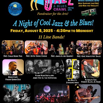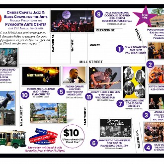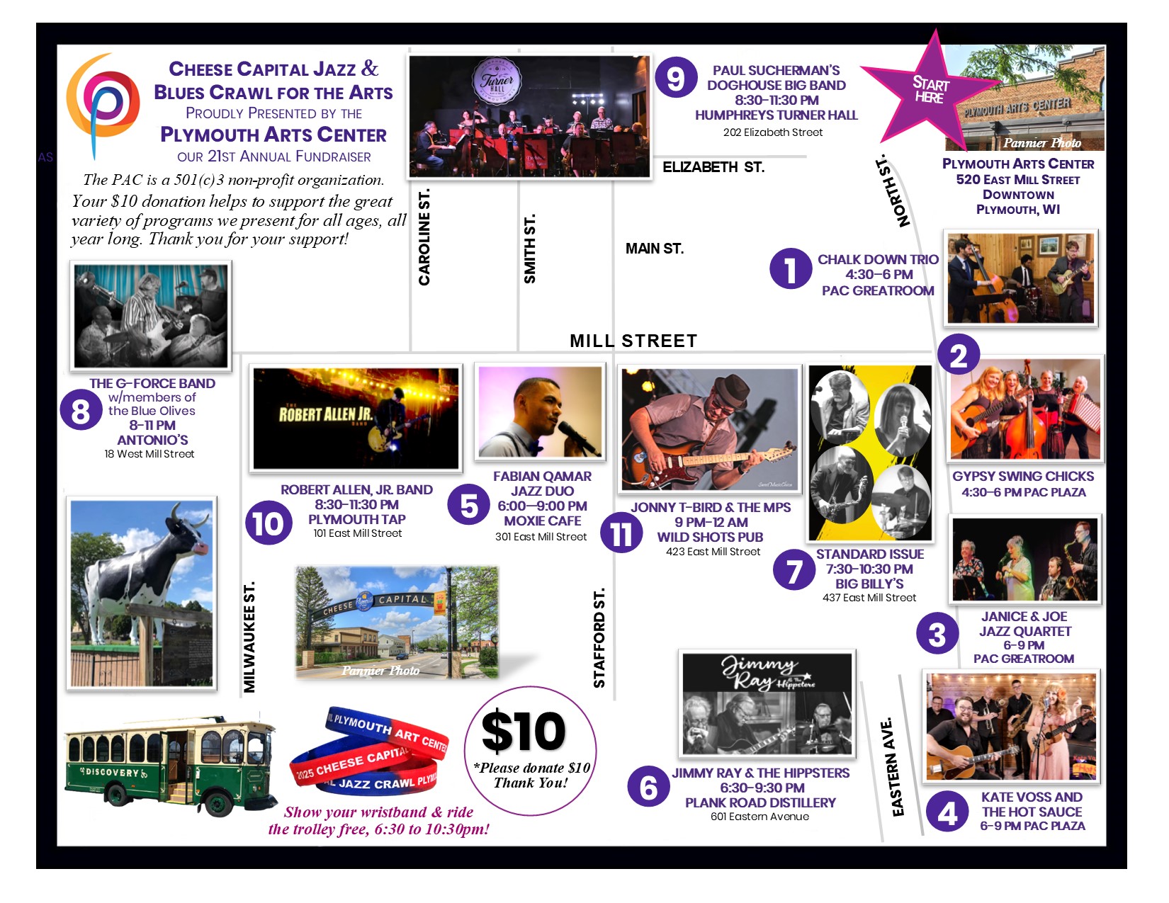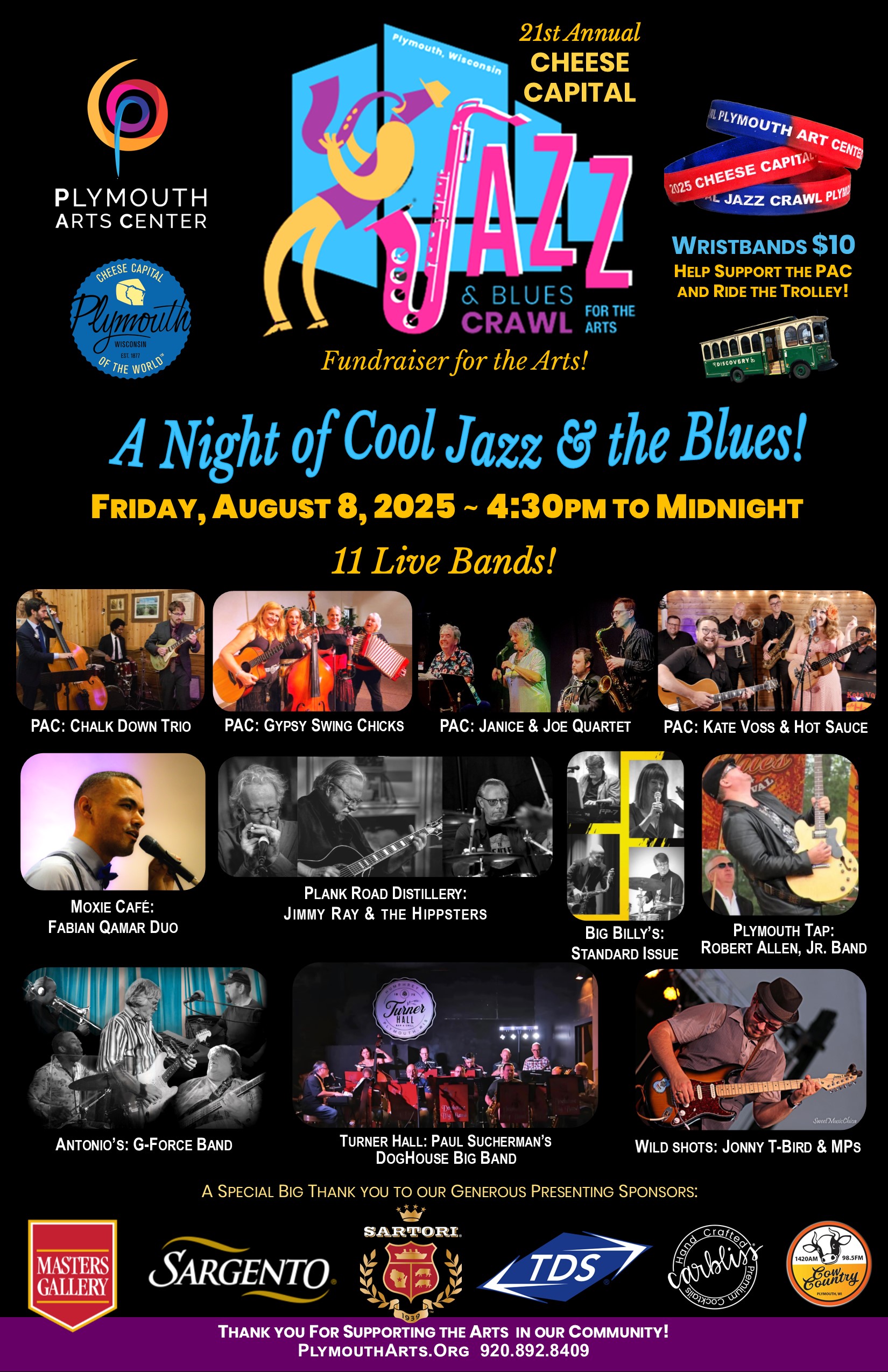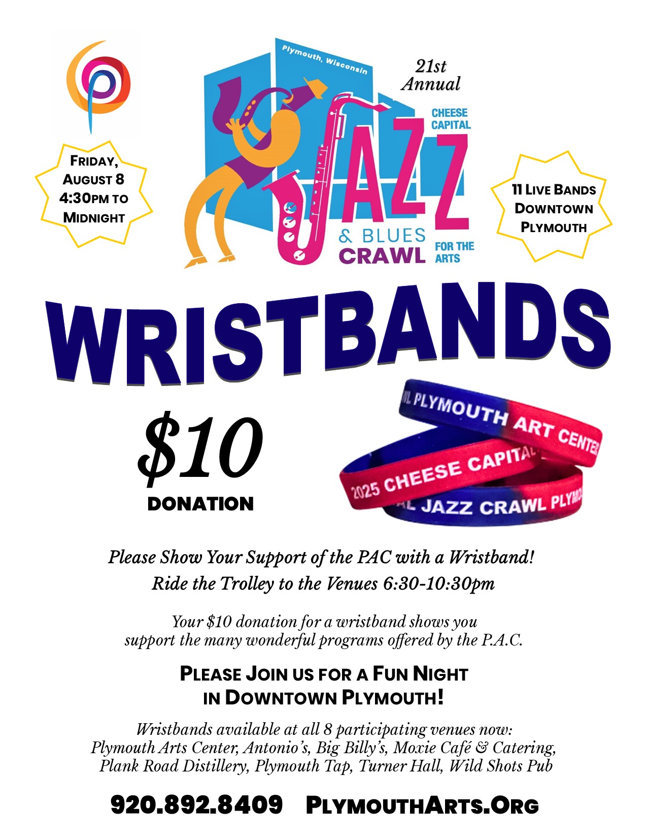 Plymouth Arts Center’s Cheese Capital Jazz & Blues Crawl for the Arts will be presented, Friday, August 8, 2025, 4:30pm-Midnight. This 21st annual live music extravaganza and fundraiser features 11 fantastic bands at the PAC in the courtyard and greatroom and at 7 Plymouth clubs and restaurants. Show your support of the PAC by purchasing the 2025 Wristband; just a $10 donation. The 2025 PAC wristband also is your passport to ride the trolley free to all the venues from 6:30pm to 10:30pm This year’s participating Jazz & Blues Crawl venues are the PAC greatroom and courtyard, Antonio’s, Big Billy’s Bar & Grill, Moxie Café & Catering, Plank Road Distillery, Plymouth Tap, Turner Hall, and Wild Shots Pub & Grill.