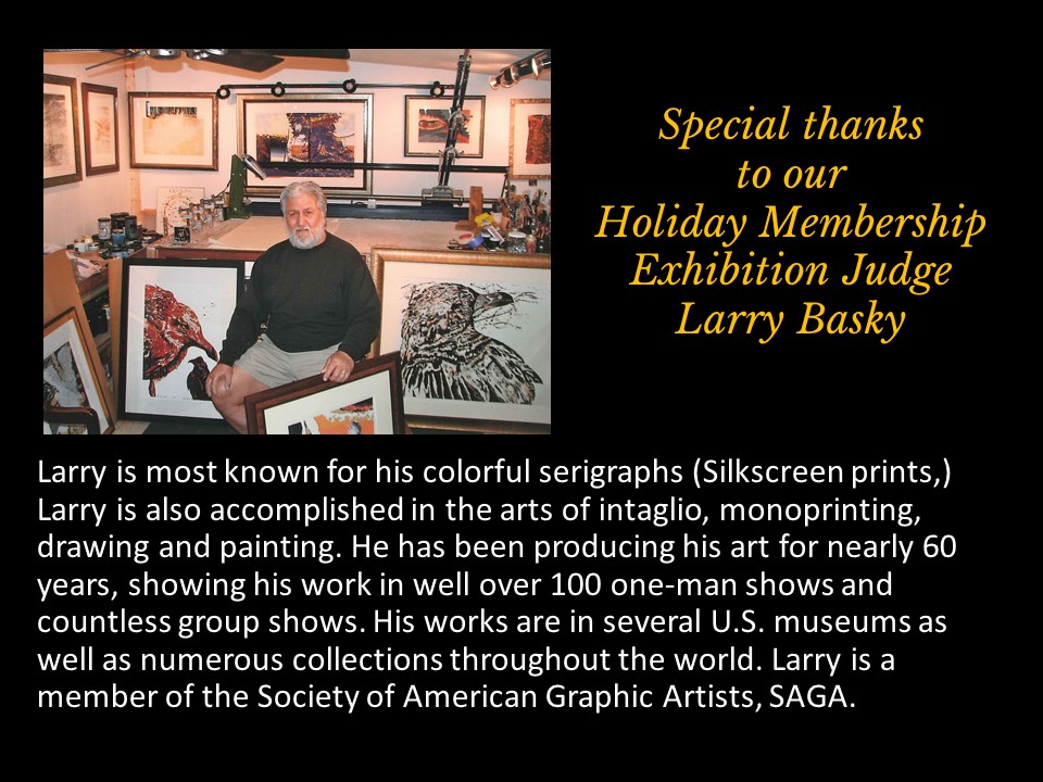 Larry Basky is the judge for this year’s membership exhibition. Larry is most known for his colorful serigraphs (Silkscreen prints), Larry is also accomplished in the arts of intaglio, monoprinting, drawing and painting. He has been producing his art for nearly 60 years, showing his work in well over 100 one-man shows and countless group shows. His works are in several US museums as well as numerous collections throughout the world. Larry is a member of the Society of American Graphic Artists, SAGA.
