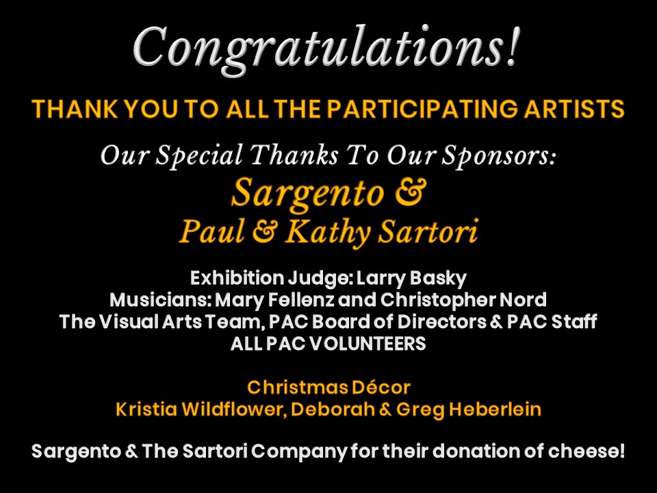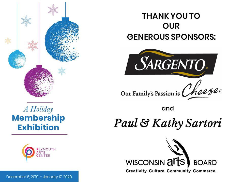 The Plymouth Arts Center is presenting a festive, public, Holiday Open House while celebrating the fine art created by its Member Artists in Gallery 110 North. This 24th Annual Holiday Membership Exhibition and Social will be held Friday, December 6th from 4:30pm to 7:30pm. The public is invited to meet the artists and join in the festivities. Live holiday musical entertainment will be presented by Mary Fellenz from 4:30pm to 5:30pm, and Christopher Nord, from 5:30 to 6:30pm. Complimentary appetizers and desserts will be served. There will be a cash bar. A brief awards ceremony will be held at 6:30pm. Presenting sponsors for this 24th Annual Holiday Membership Show are: Sargento, Paul and Kathy Sartori and the Wisconsin Arts Board. The show runs through Friday, January 17, 2020.