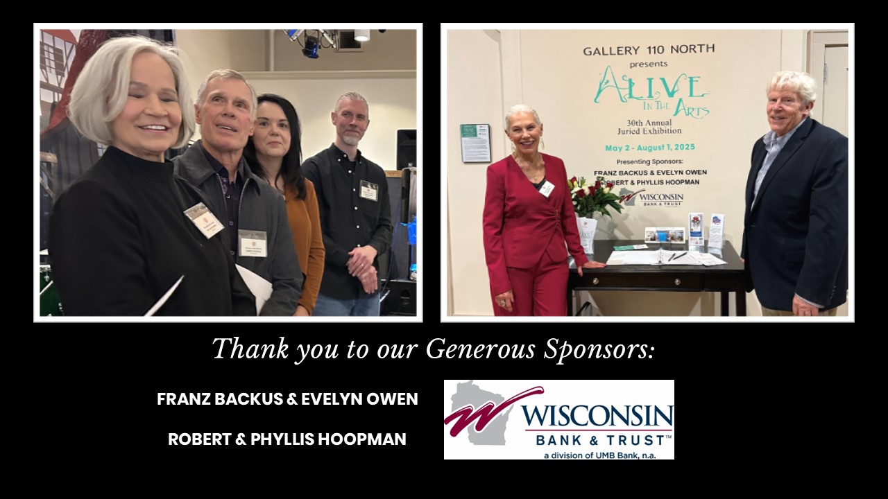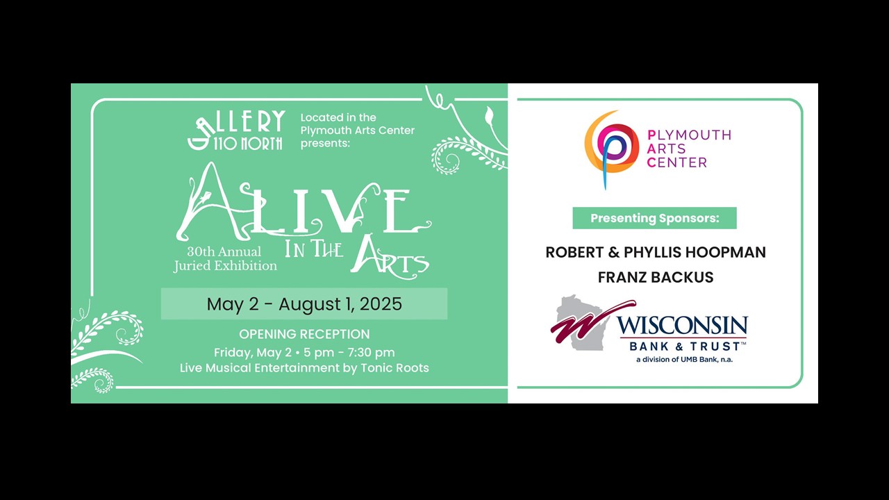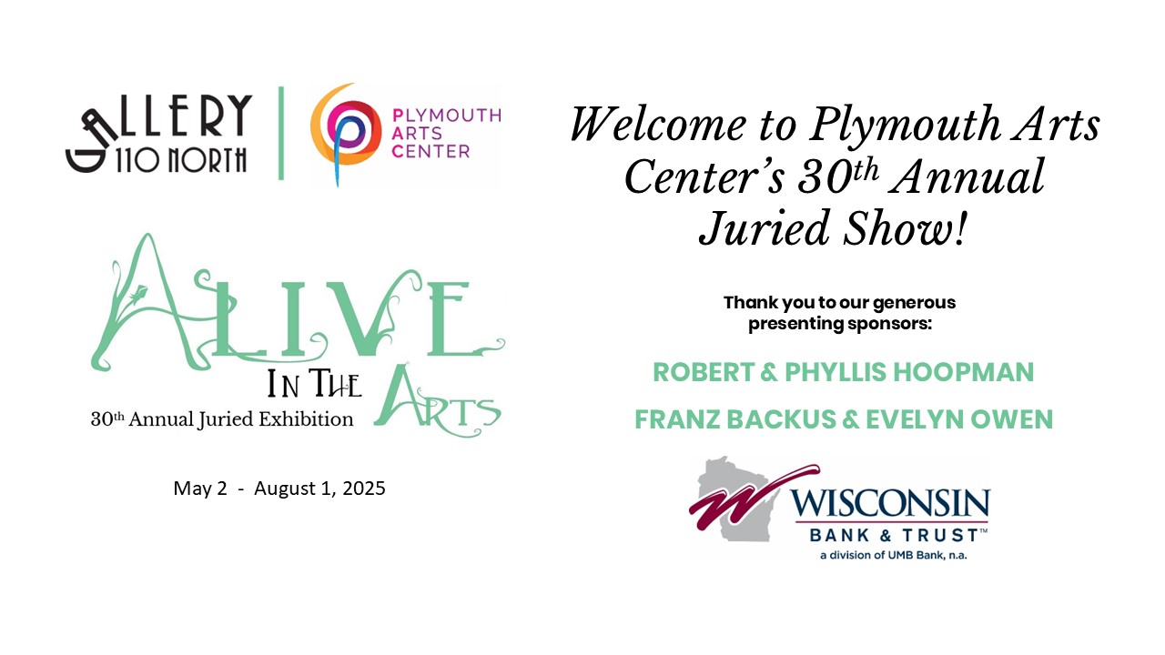 PLYMOUTH, WI- “Alive in the Arts,” Plymouth Arts Center’s 30th annual juried exhibition opened in Gallery 110 North, Friday, May 2, 2025. Joye Moon was the juror for this annual competition. Joye reviewed artwork from artists living and working throughout the state of Wisconsin and selected 85 pieces for this brand-new show. The public was invited to meet the artists at the opening reception Friday, May 2nd from 5-7:30 pm. Live musical entertainment was presented courtesy of the Tonic Roots Band. Complimentary appetizers & desserts were served with a cash bar. “Alive in the Arts” will be on display through August 1, 2025. The presenting sponsors are Franz Backus, Robert & Phyllis Hoopman, and Wisconsin Bank and Trust, a division of UMB Bank.