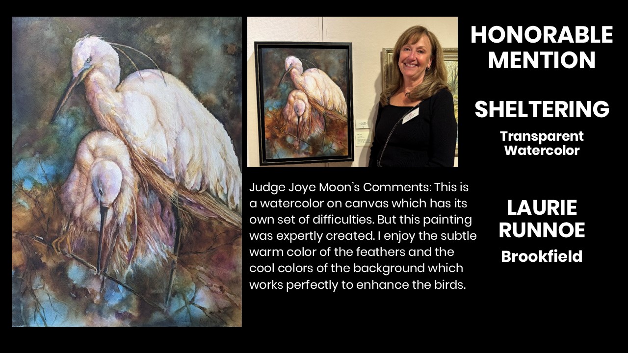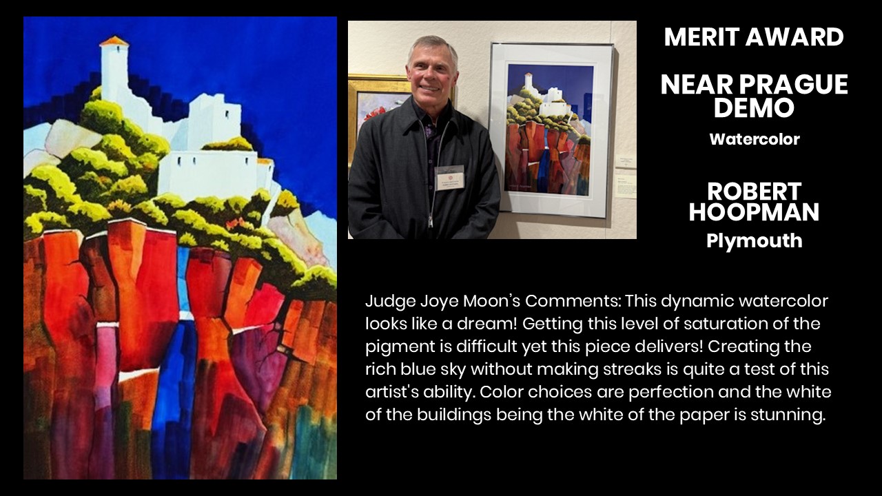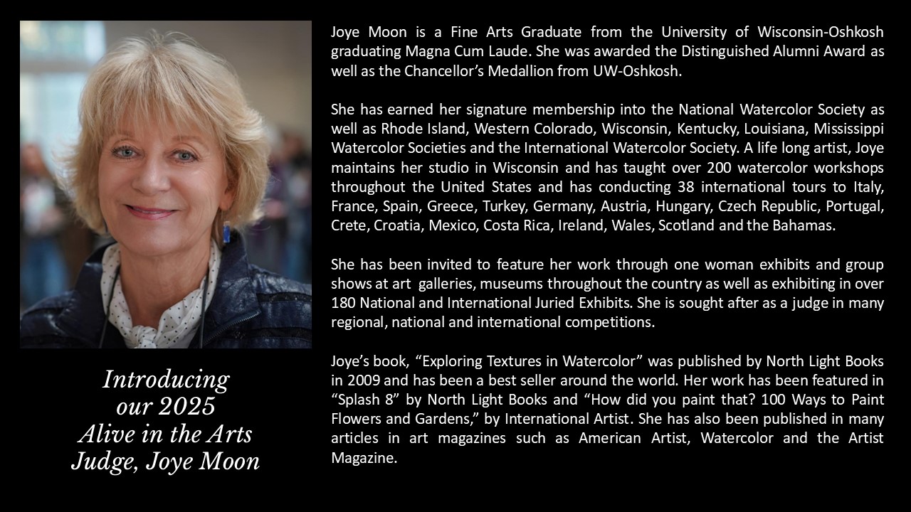 About the Judge: Joye Moon is based in Oshkosh, WI, and is an artist, art educator, and author of Exploring Textures in Watercolor, pub. 2009. She has taught over 200 watercolor workshops and led 38 international artists’ group tours around the world. Her work has been exhibited in over 180 National and International juried competitions.