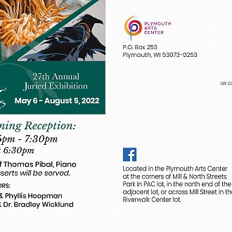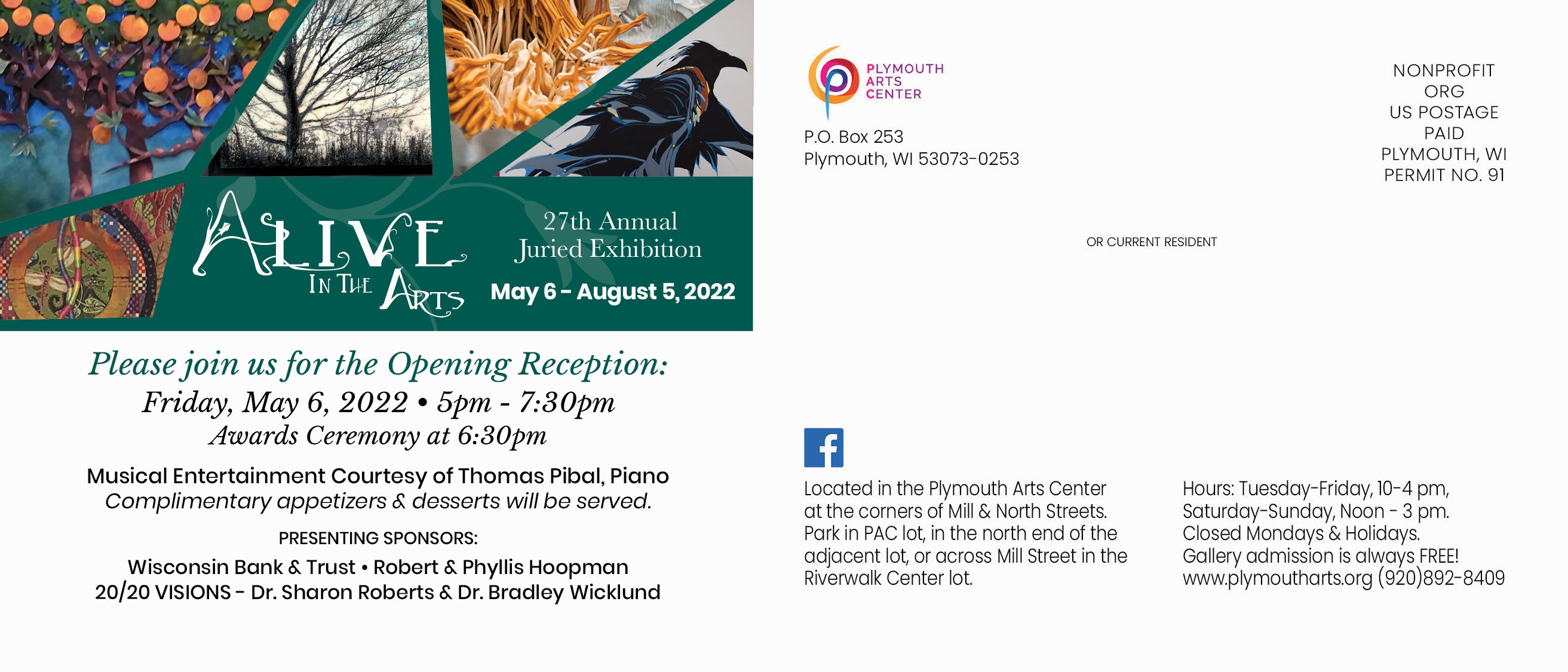 PLYMOUTH, WI- The Plymouth Arts Center will open a new art exhibit in Gallery 110 North on Friday, May 6th. “Alive in the Arts” is the organization’s 27th annual juried exhibition showcasing Wisconsin Fine Artists. Artist Denise Presnell was the juror for this competition. She reviewed artwork from artists living and working throughout the state of Wisconsin and has chosen over 55 pieces for this new show. The public is invited to attend the opening reception Friday, May 6th from 5-7:30 pm. Live musical entertainment will be provided courtesy of Thomas Pibal, piano. Complimentary appetizers & desserts will be served with a cash bar. “Alive in the Arts” will be on display through August 5, 2022. The presenting sponsors are Robert & Phyllis Hoopman, Wisconsin Bank and Trust, and 20/20 Visions/ Dr. Sharon Roberts and Dr. Brad Wicklund.