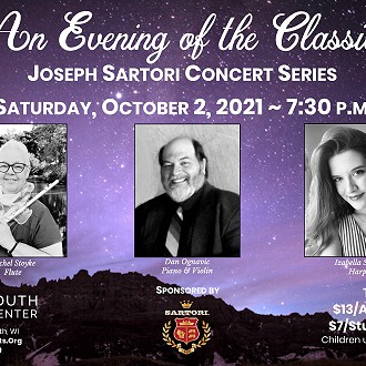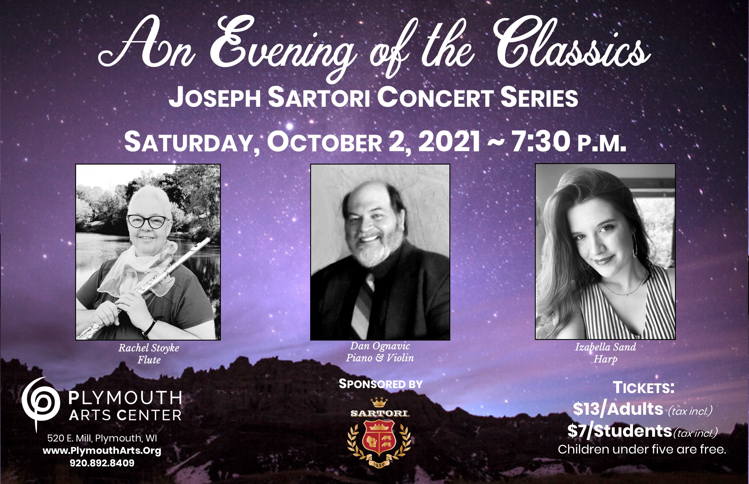 The Plymouth Arts Center proudly presents an evening of fine performances in the semi-annual Joseph Sartori Concert Series, “An Evening of the Classics,” on Saturday, October 2, 2021, at 7:30 PM. The series is graciously underwritten by the Sartori Company. The concert performers are: Rachel Stoyke, flute, Plymouth; Dan Ognavic, piano and violin, Sheboygan; and Izabella Sand, harp. Tickets for the concert are $13 (tax incl.) for Adults and $7 (tax incl.) for Students. Children under 5 are free. Please visit the Plymouth Arts Center at 520 E. Mill Street, downtown Plymouth, WI; call: (920) 892-8409; email: info@plymoutharts.org; or purchase online: www.plymoutharts.org.