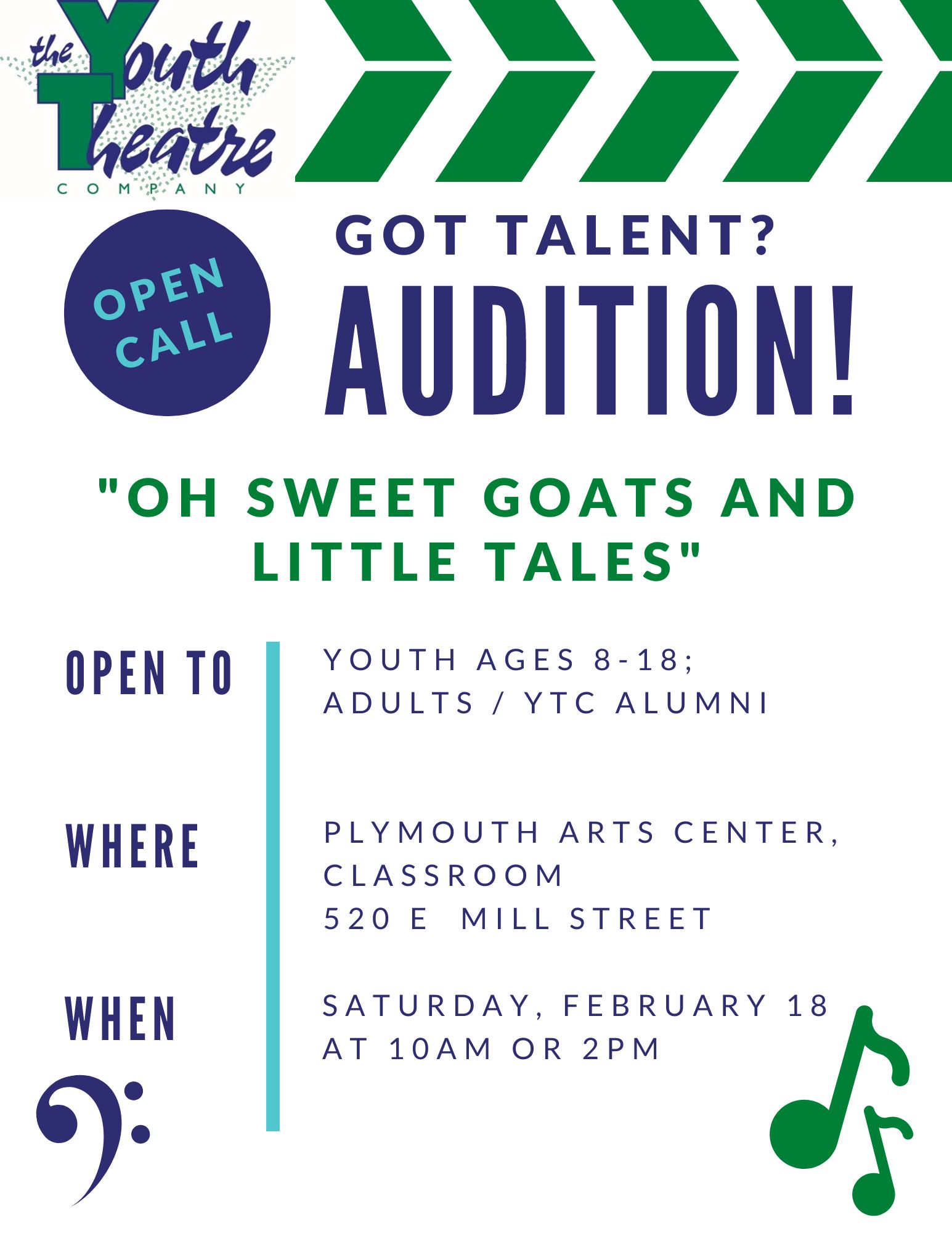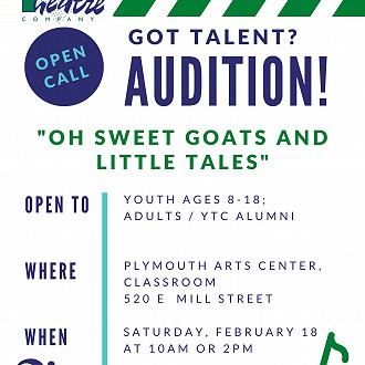 Have you ever attended a Youth Theatre Company show and imagined yourself up on the stage? Well, now is your chance! Auditions are less than two weeks away for “Oh Sweet Goats and Little Tales!” We want YOU! Help us celebrate 35 years of YTC in Sheboygan County and 30 years of the Plymouth Arts Center. Get excited! It’s your time to shine. On Saturday, February 18, the Youth Theatre Company will be hosting auditions (10am or 2pm) at Plymouth Arts Center, and we would love to see community members and youth come out to be part of this wonderful show - a nostalgic journey of YTC fables and stories with a bit of song and dance and a Bluegrass twist. For additional information, please contact Tim & Patty Talen by calling 920-893-0528.