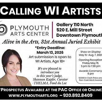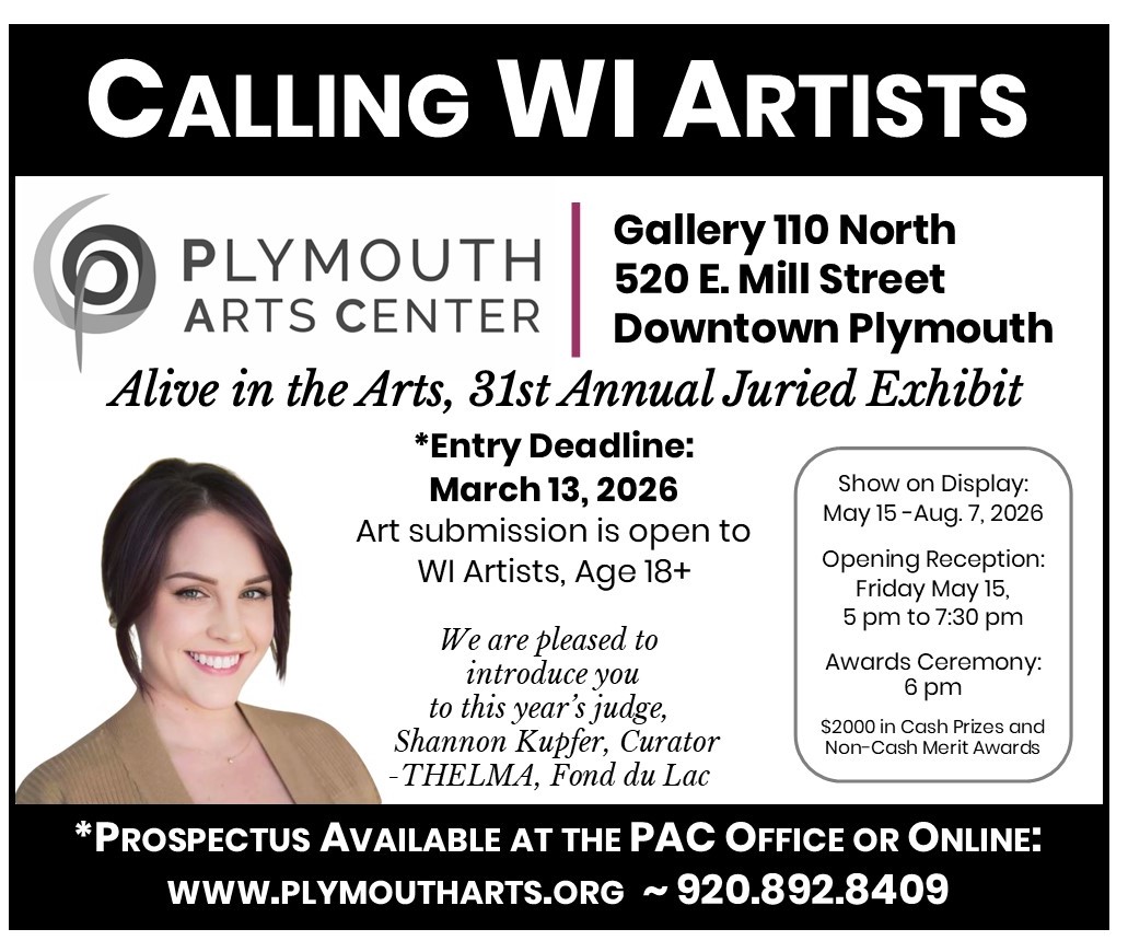 Open to all two and three-dimensional fine art media including, but not limited to, pastel, painting, sculpture, graphite, drawing, photography, fiber, ceramics, metal, glass, wood, paper, jewelry, leather, printmaking and mixed media. Please note: the PAC will accept jpeg images saved to CD’s, flash or thumb drives or an alternate online option which may be accessed on the PAC’s dedicated Gift Shop website: https://www.plymouthartsgiftshop.com/contact-8 The postmarked deadline for entries is Friday, March 13, 2026. To receive a prospectus, please call the Plymouth Arts Center (920) 892-8409, E-mail: info@plymoutharts.org, or applications may be downloaded from the PAC website: www.plymoutharts.org