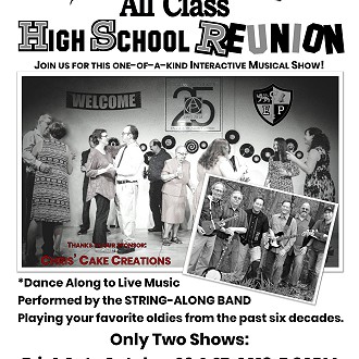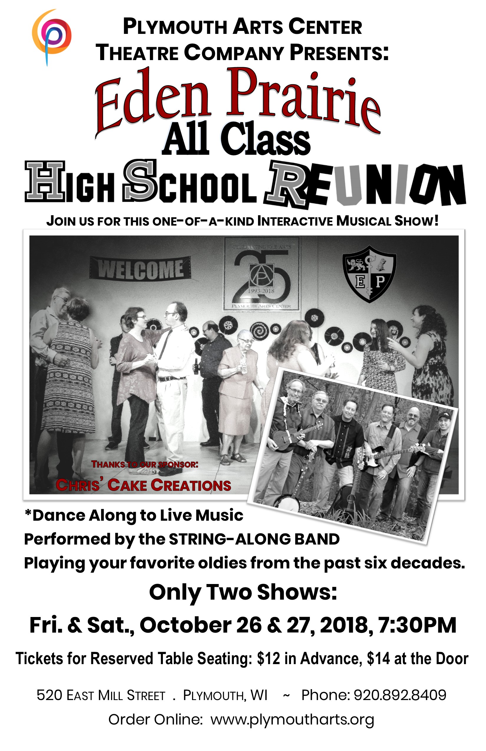 The “Eden Prairie All-Class High School Reunion” musical is a brand-new theatre production and dance written and directed by Kerrylynn Kraemer featuring the ever-popular String Along Band. The Plymouth Arts Center invites you to take a Stroll Down Memory Lane as our cast of characters from Eden Prairie High School reminisce about those glory years. Find out what has happened to them since their high school days at “The All-Class High School Reunion.” You will enjoy listening and dancing to all those wonderful tunes from the past decades played by the String Along Band. Only two shows will be presented: Friday, Oct. 26 and Saturday, Oct. 27 at 7:30pm at the Plymouth Arts Center, 520 E. Mill Street, Downtown Plymouth, WI. Join us for this one-of-a-kind interactive show! Tickets for reserved table seating are: $12 in advance and $14 at the door tax included. A Cash Bar will be available. Tickets may be purchased at the PAC Box Office Tuesday-Friday, 10am to 4pm, call 920.892.8409.