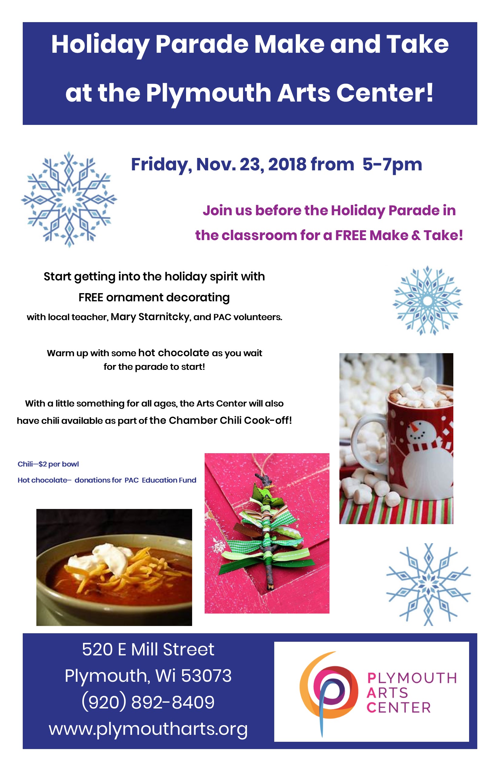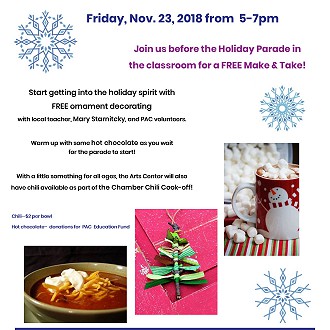 Inspire your holiday spirit with the Plymouth Arts Center! On Friday, November 23, 2018 ditch the shopping madness for some quality family time. From 5-7pm the Plymouth Arts Center will be hosting free make-and-take ornament crafting for kids in conjunction with the chili cookoff, followed by Plymouth’s Holiday Parade! Bring the whole family to enjoy the festivities and spread the word to your friends! All ages welcome.