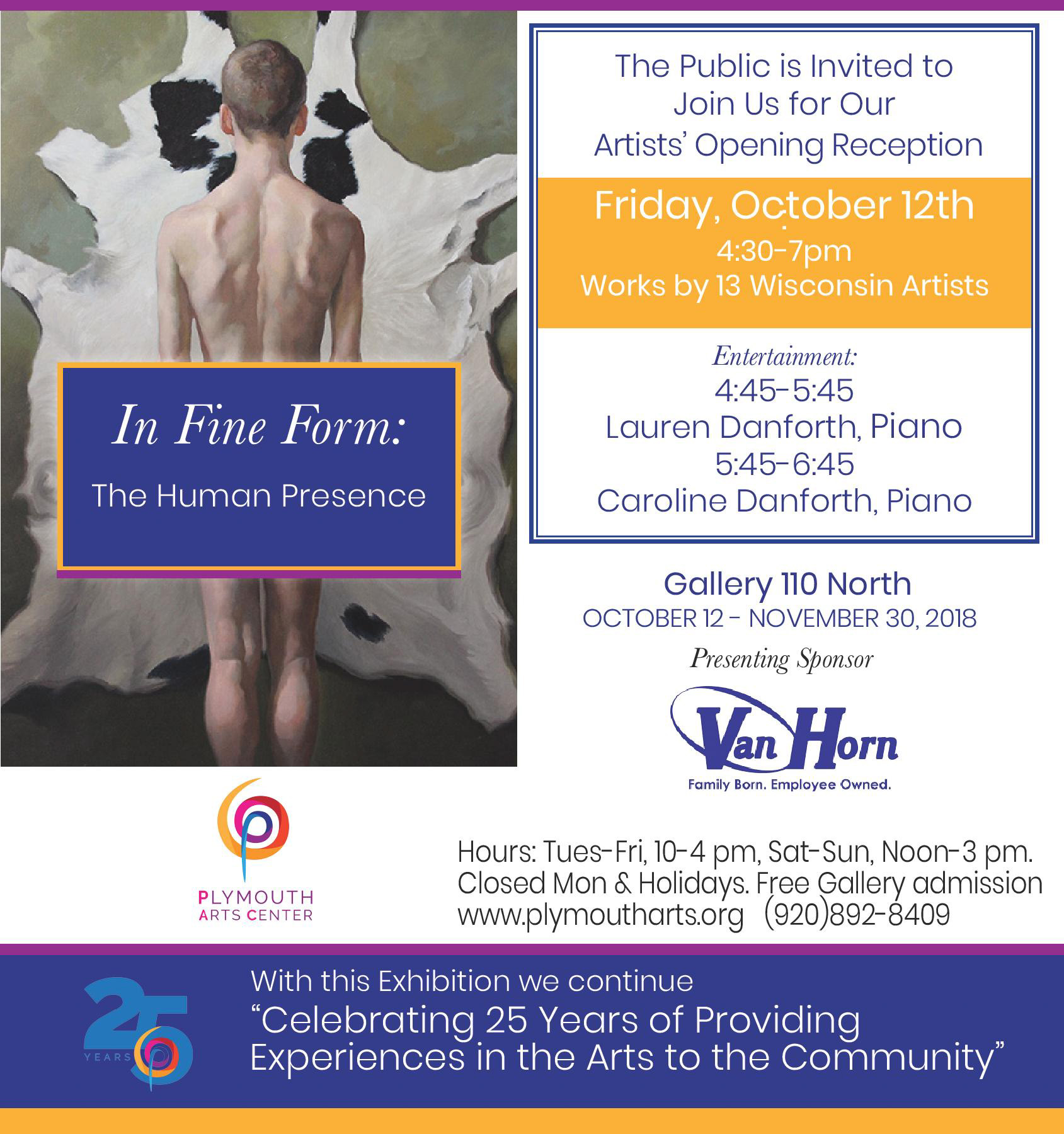 “Gallery 110 North has built an outstanding reputation over the past 25 years for redefining what a small city Arts Center can accomplish. We are very honored to showcase the work of these talented, award-winning artists as we continue to celebrate our 25th Anniversary,” said Donna Hahn, executive director of the Plymouth Arts Center.