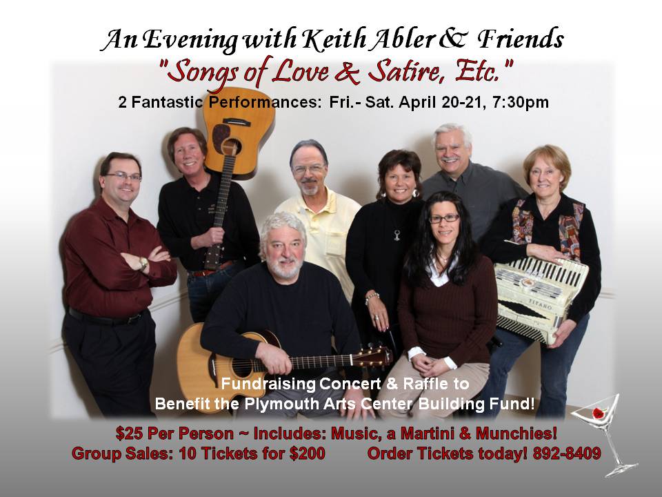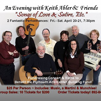View a Clip of the Show on You Tube: https://www.youtube.com/watch?v=QwTPD_z6MfE Keith’s inaugural Plymouth Arts Center show, entitled “Live Art,” was presented in 2001. Since that time, Keith Abler and Friends have generously presented numerous fundraising concerts for the benefit of the PAC. Performers for this concert, “An Evening with Keith Abler & Friends….Pilgrims & Pirates, Love @ 25” are Keith Abler, Luke Abler, Brian Augustine, Larry Baldock, Frank Gatyas, Cindy Howley, Bob McManus, Amy Schmidt, John Stoll, and Tim and Patty Talen.