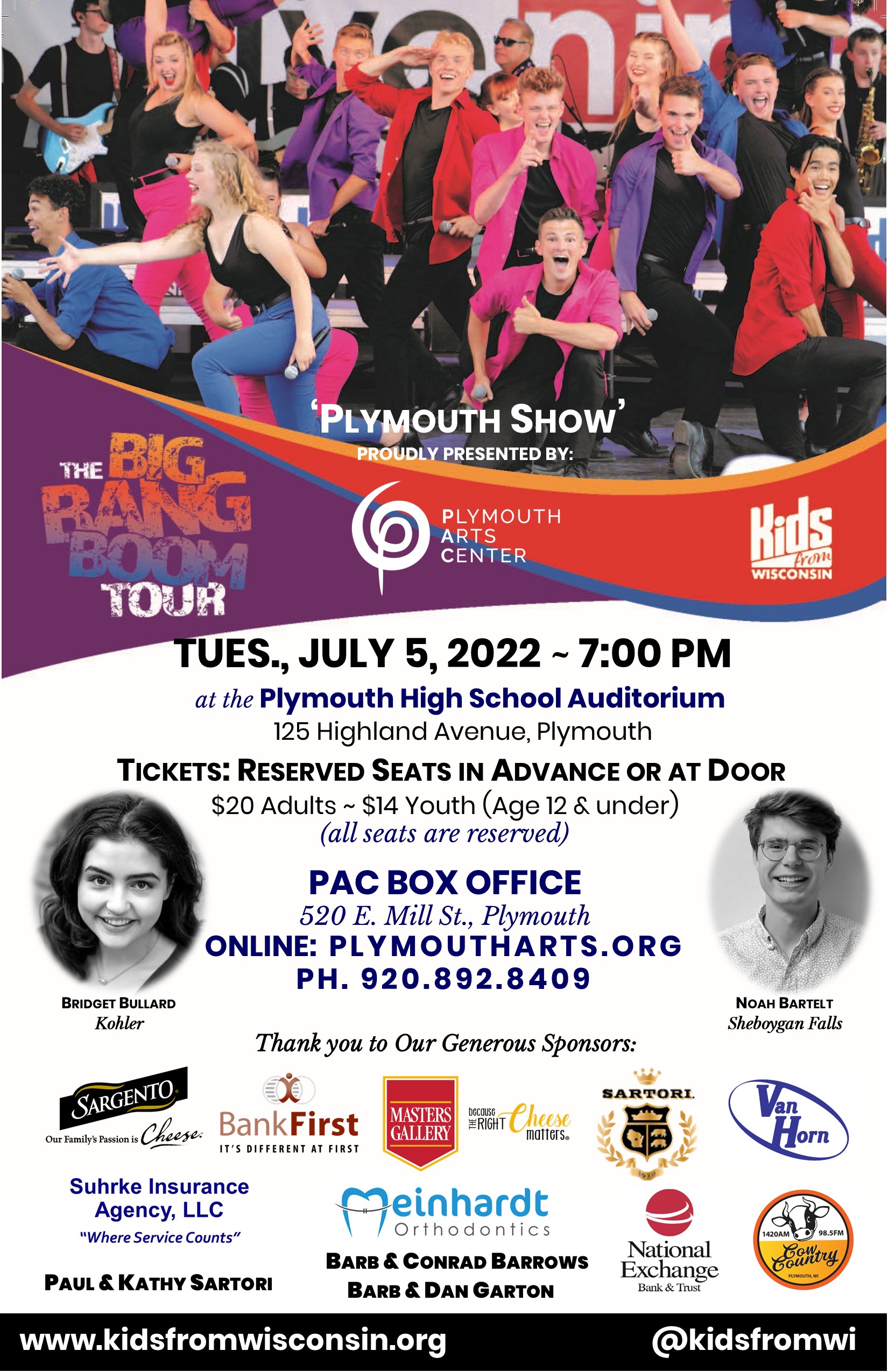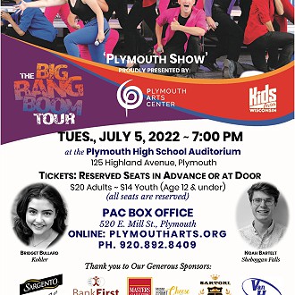 This year’s “Plymouth Show” is presented by the Plymouth Arts Center with a one-time evening performance at the Plymouth High School Auditorium on Tuesday, July 5th, 2022 at 7:00 pm. Tickets for Reserved Seats for the ‘Plymouth Show’ are available now at the Plymouth Arts Center Box Office. (All seats are reserved, so please order early.) Tickets will be sold at the PAC office up until 4pm on the day of the show. Remaining tickets will be sold at the Plymouth High School Box Office, beginning at 6pm (which is one hour before showtime of 7 pm.) Tickets are: $20 (tax included) for Adults and $14 (tax included) for Youth (12 & Under) Mastercard and Visa are accepted. Visit the PAC box office at 520 East Mill St., Downtown Plymouth, Tues-Fri. 10am to 4pm, OR order online through our ticket service: www.plymoutharts.org, call (920) 892-8409. All proceeds of the show benefit the Plymouth Arts Center, a 501c3 non-profit organization.