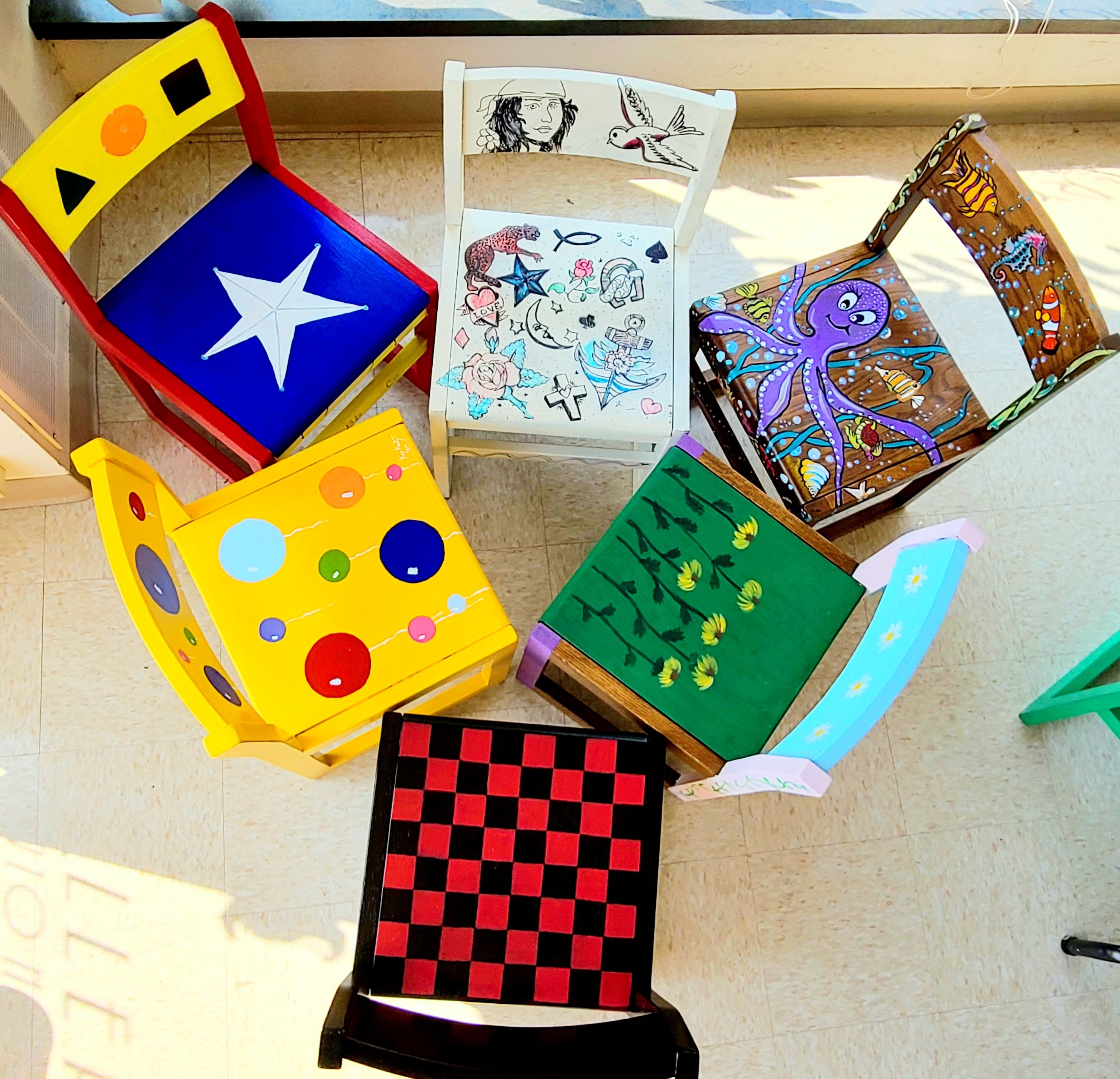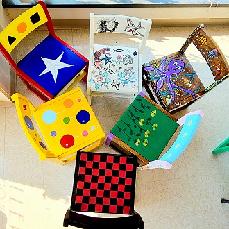 Plymouth Library Director, Leslie Jochman, said, “With the purchase of the new furniture for the library, we wanted to come up with a creative way to reuse or sell some of the old furniture. After speaking with other library directors, I heard about chair art auctions. I am very thankful to the Plymouth Arts Center staff for recruiting the artists to paint the chairs. As a mom, I know our painted chairs will be popular for families to have for their children. The chairs we have available for bid will make a great addition to someone’s playroom.”