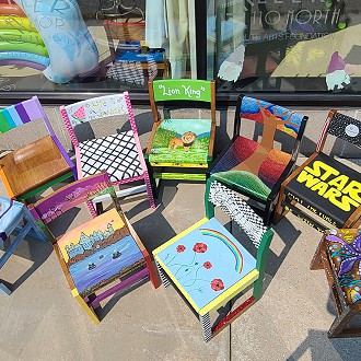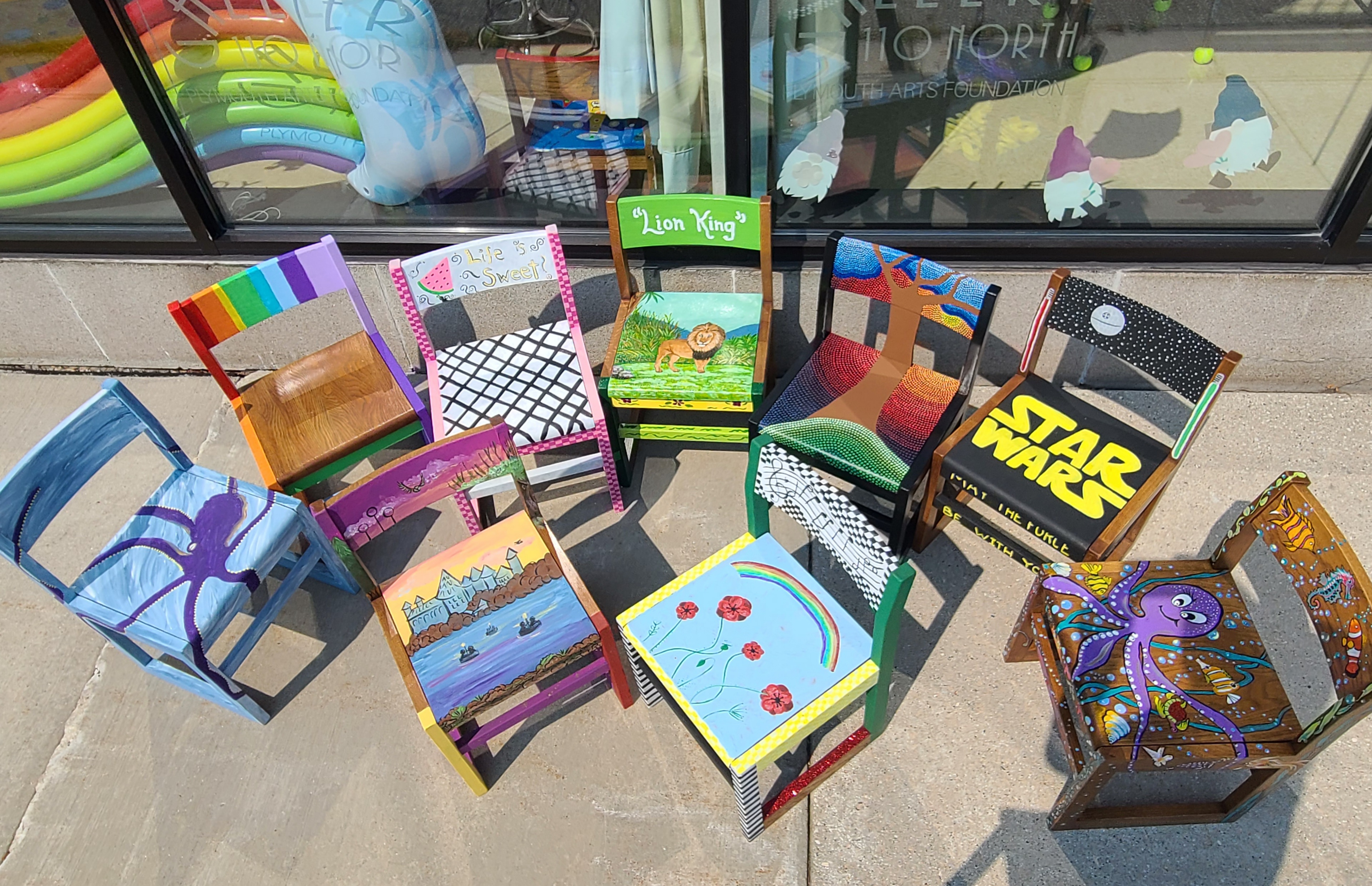 The Plymouth Arts Center invited area artists to share their creativity by painting the chairs. 19 Chairs will be auctioned off with all proceeds benefitting the Library and the Plymouth Arts Center.