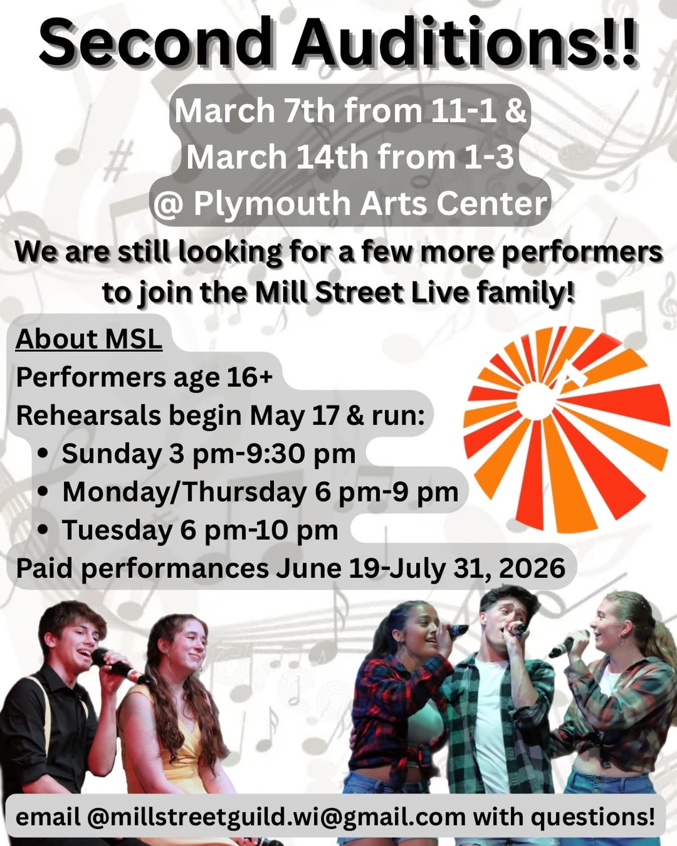 We are still seeking a few more performers to audition for this year’s cast of Mill Street Live. Consider trying out for this exciting and fun show and a wonderful experience! Join in the fun!