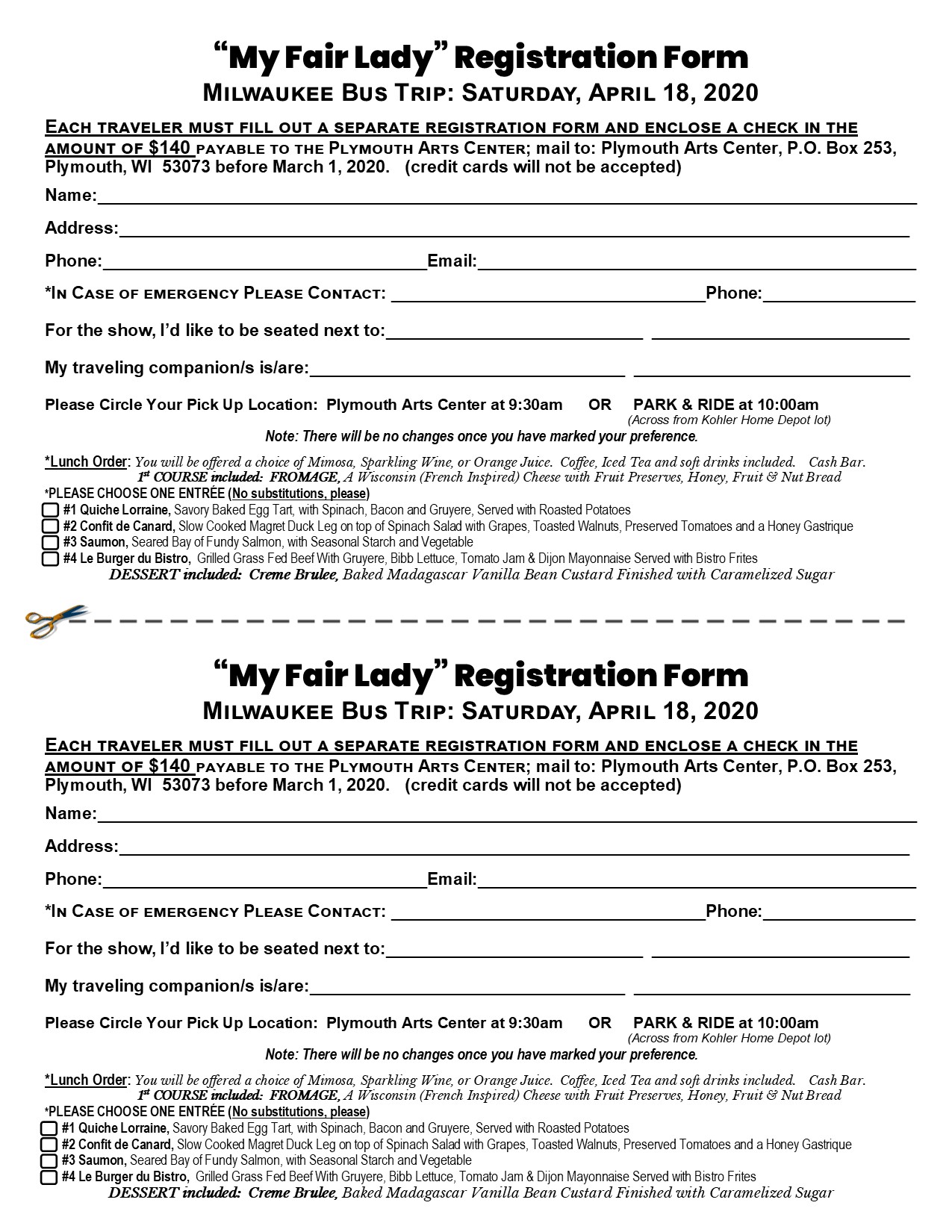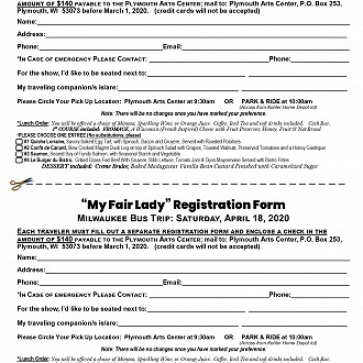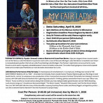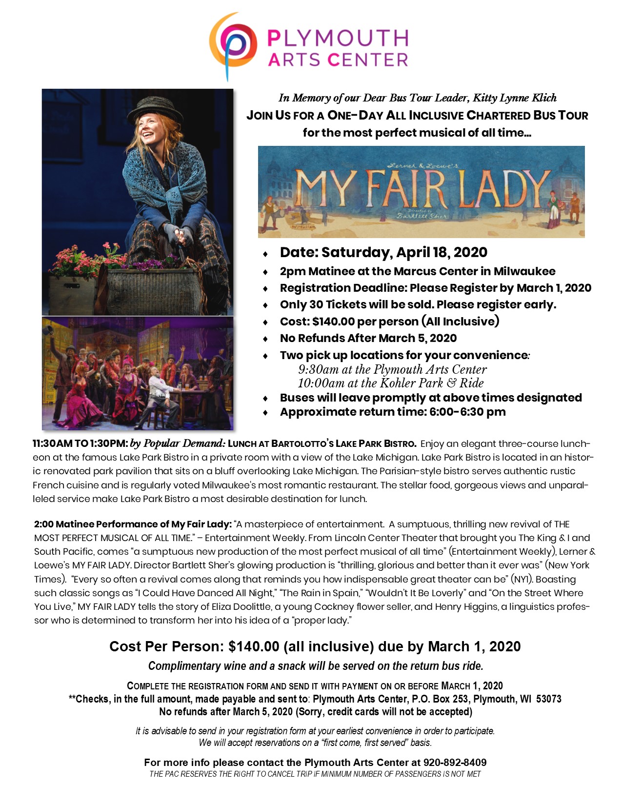 Date: Saturday, April 18, 2020 2pm Matinee at the Marcus Center in Milwaukee Registration Deadline: Please Register by March 1, 2020 Only 30 Tickets will be sold. Please register early. Cost: $140.00 per person (All Inclusive) No Refunds After March 5, 2020 Two pick up locations for your convenience: 9:30am at the Plymouth Arts Center 10:00am at the Kohler Park & Ride Buses will leave promptly at above times designated Approximate return time: 6:00-6:30 pm