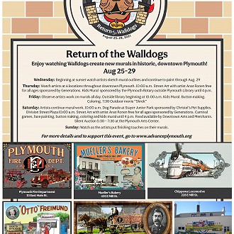 Saturday: Artists continue mural work. 10:00 a.m. Dog Parade at Stayer Junior Park sponsored by Christel’s Pet Supplies. Division Street Plaza 10:00 a.m. Street Art with artist Anat Ronen free for all ages sponsored by Generations. Carnival games, face painting, button making, coloring and kids mural until 4 p.m. Food available by Downtown Arts and Merchants. Silent Auction 5:30 - 7:30 at the Plymouth Arts Center.