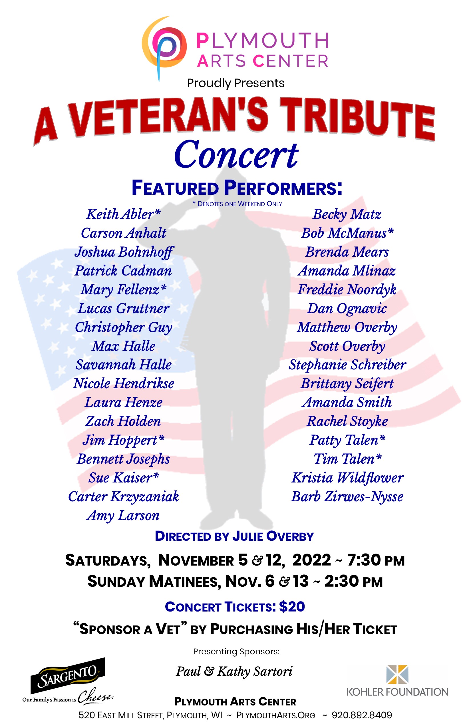 The Veteran’s Tribute Concert is sponsored by Sargento, the Kohler Foundation, Paul and Kathy Sartori, and the Wisconsin Arts Board. Tickets are $20 per person and include a complimentary dessert. Please visit the Plymouth Arts Center at 520 E. Mill Street, downtown Plymouth, WI; call: (920) 892-8409; email: info@plymoutharts.org; or online: www.plymoutharts.org