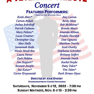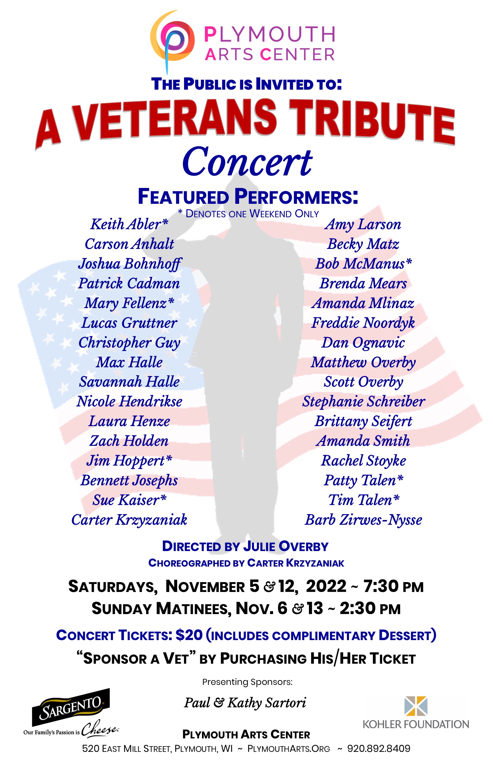 Click Here to View and Print Veteran’s Tribute Concert Poster The Plymouth Arts Center is pleased to present a brand-new musical tribute show to honor and show appreciation to our nation’s veterans for their service and for defending our freedom. Veterans, Active Military Personnel and the General Public are invited to attend. “A Veterans Tribute Concert” is a variety show featuring military and patriotic songs from our country’s 245-year history. The show is coordinated and directed by Julie Overby and will showcase over 30 community performers who are sharing their time and talent to thank our vets. Four shows will be presented: Saturday, November 5 at 7:30 p.m. and Sunday, November 6 at 2:30 p.m. (Note: Daylight Saving Time,) Saturday, November 12 at 7:30 p.m. and Sunday, November 13, at 2:30 p.m. The show is sponsored by Sargento, the Kohler Foundation, Paul and Kathy Sartori, and the Wisconsin Arts Board.