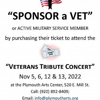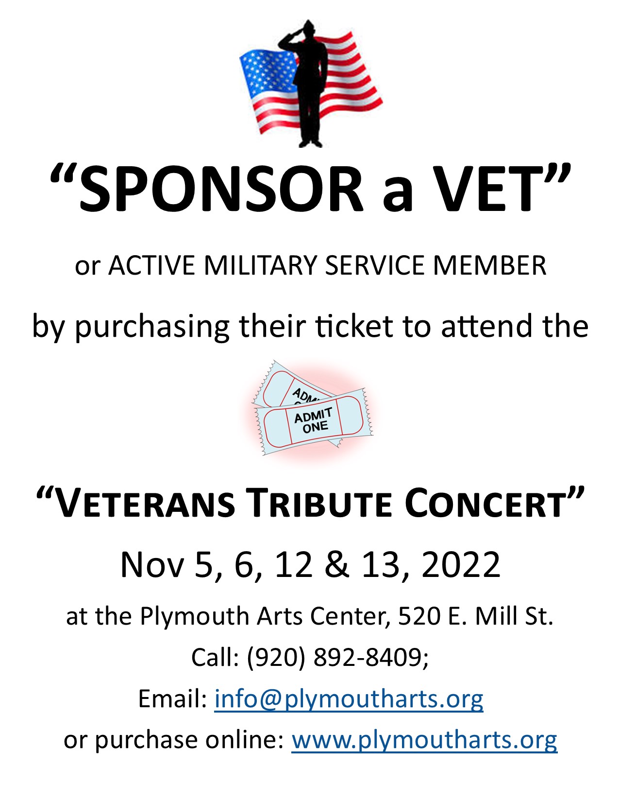 Veterans and active military personnel may register with the Plymouth Arts Center before October 1st to receive a complimentary ticket. Community members and businesses who wish to “Sponsor a Vet” by purchasing a Vet’s show ticket/s are encouraged to contact the Plymouth Arts Center as soon as possible. Tickets for the concert are $20 (tax incl.) Complimentary dessert will be served. Please visit the Plymouth Arts Center at 520 E. Mill Street, downtown Plymouth, WI; call: (920) 892-8409; email: info@plymoutharts.org; or purchase online: www.plymoutharts.org.
