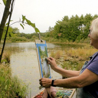 The members engage with nature largely by painting “en plein air”, which means direct from nature. They may gather together, go far afield, or simply spend time quietly creating in their own backyards and communities. Artistically capturing and celebrating these wild, watery places and storied sites means being out in all kinds of weather. During seasons of sun and snow, solstice and slumber, you can find them with painting partners at each elbow, or just around the bend.